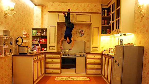 Terdapat belasan sudut seperti ruang keluarga, kamar tidur, dapur dan bagian rumah lainnya. Benda-benda seperti meja, kursi, kaca dan berbagai perabot ditempel di atas langit-langit sehingga terlihat melawan gravitasi.