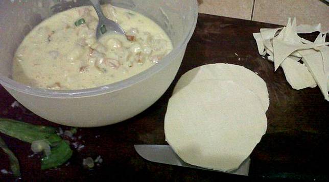 Kocok telur kemudian masukkan udang dan ayam yang telah dicincang, tepung kanji, minyak wijen, garam dan rajangan daun bawang. Aduk rata sampai menjadi adonan yang bisa dibentuk.